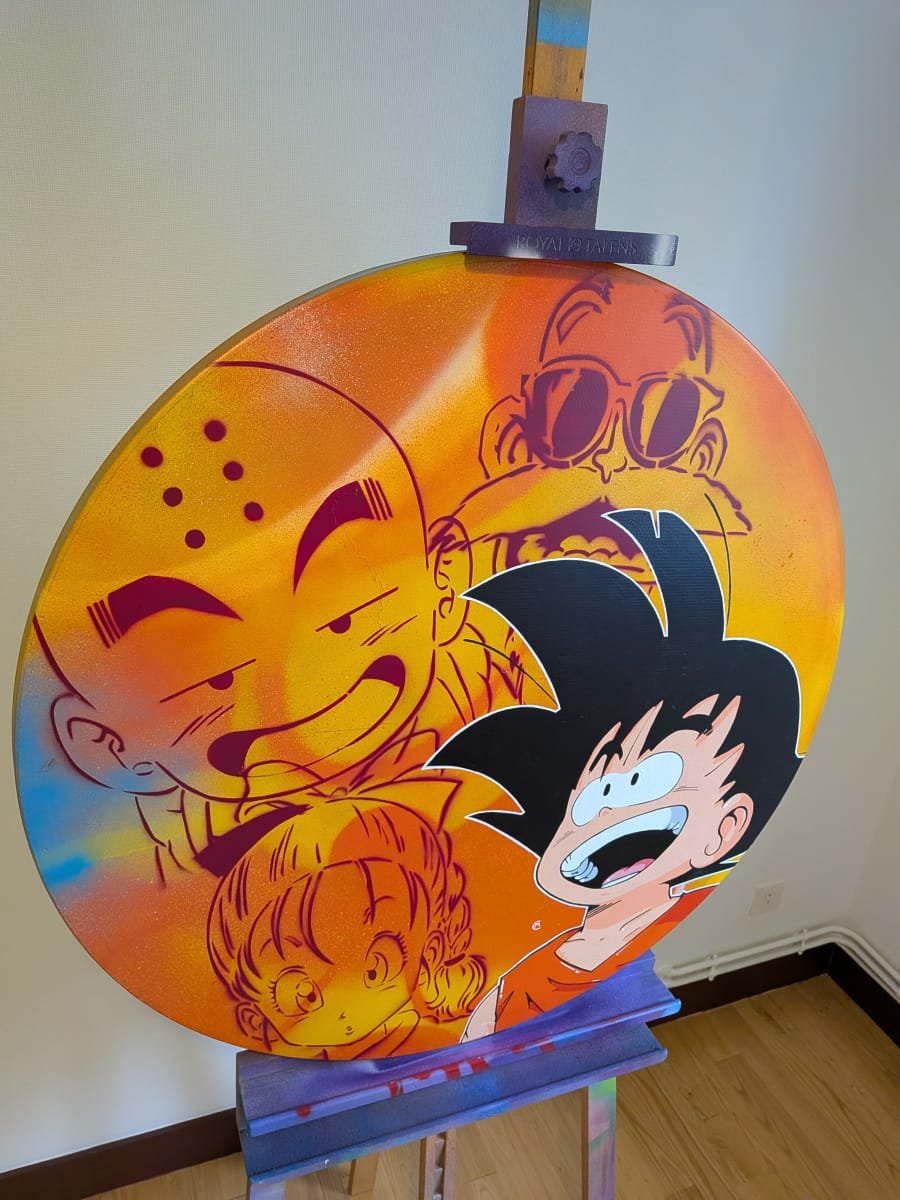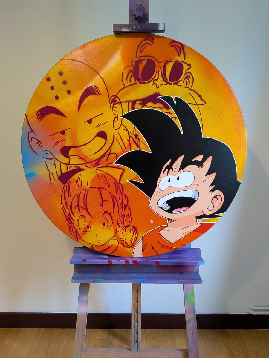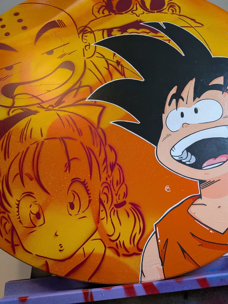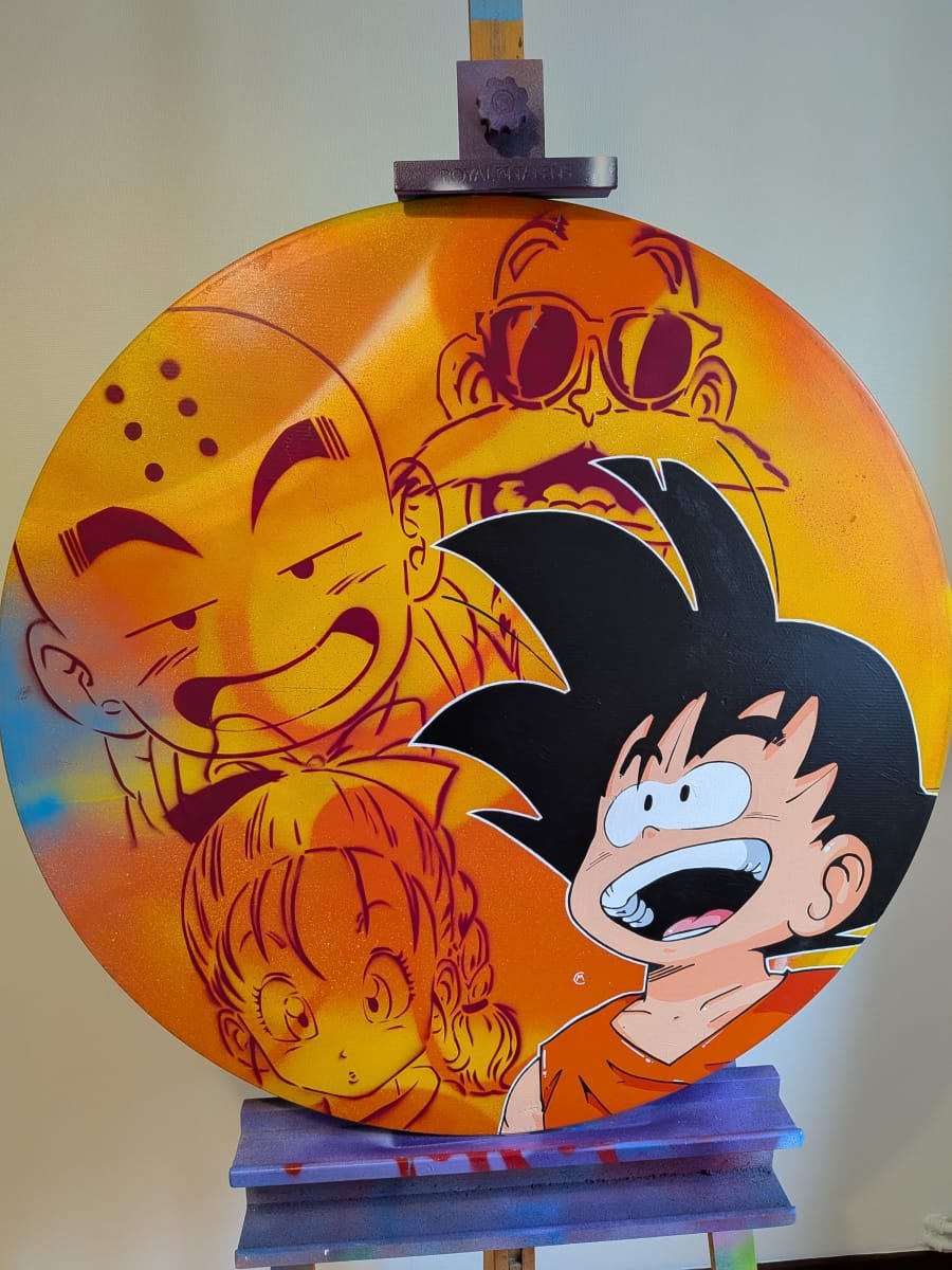 Œuvre street-art circulaire spectaculaire peinte sur un authentique panneau de signalisation routière rond : hommage pop et explosif à Dragon Ball avec un jeune Son Goku enfant en premier plan, bouche grande ouverte dans un cri légendaire, entouré des silhouettes au pochoir orange de Krilin, Tortue Géniale et Bulma. Fond dégradé orange-jaune solaire qui rappelle la couleur des boules de cristal réalisé à la bombe, contours noirs ultra-précis et touches de bleu électrique en bas pour le contraste. Format parfait, énergie manga 90’s et vibe rétro-gaming immédiate : pièce collector idéale pour décorer votre intérieur.