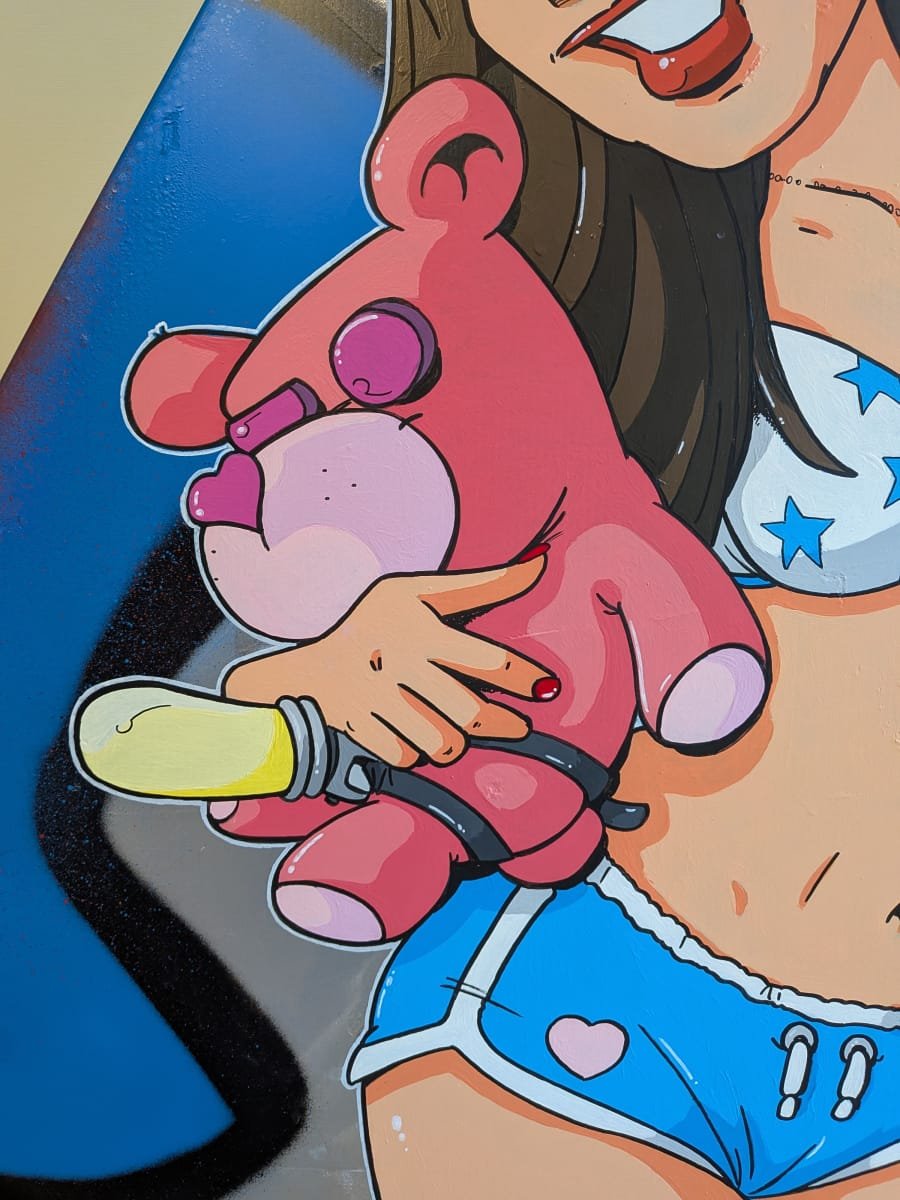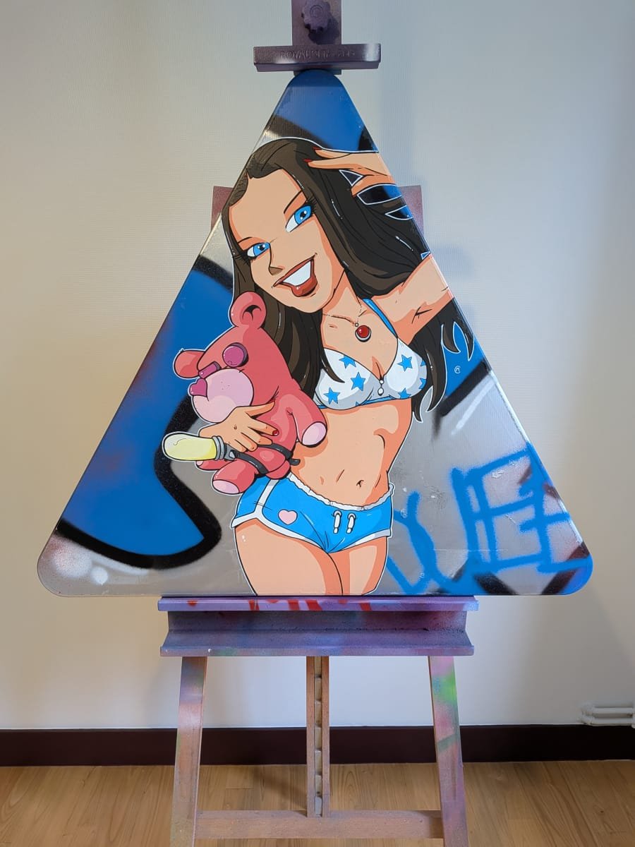 Le personnage BD de Kloe Love a été choisi par Marcel Champion pour illustrer ce panneau. Pin-up ultra glamour aux longs cheveux noirs, bikini et shorty bleu étoilé, regard malicieux et sourire éclatant, Kloe tient entre ses bras un gros teddy bear rose armé d’un jouet sexy prêt à faire feu. Fond graffiti bleu électrique et chromé avec tags urbains dynamiques pour donner à cette nouvelle pièce un coté sexy et tendance qui va ravir les fans de pop culture.