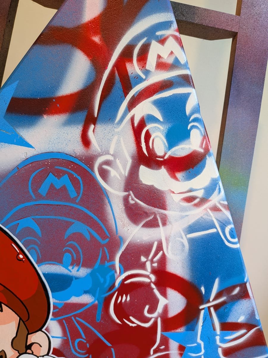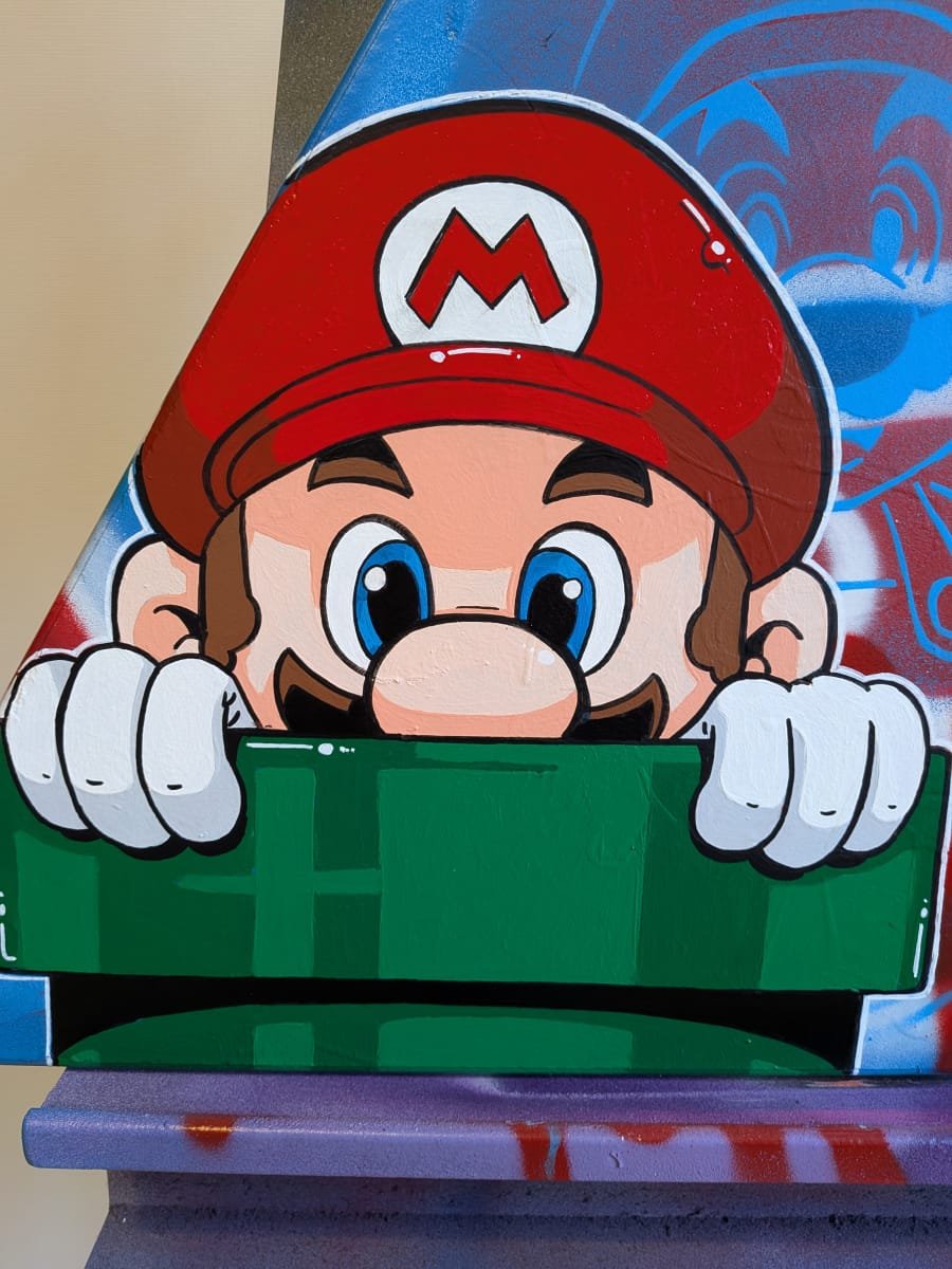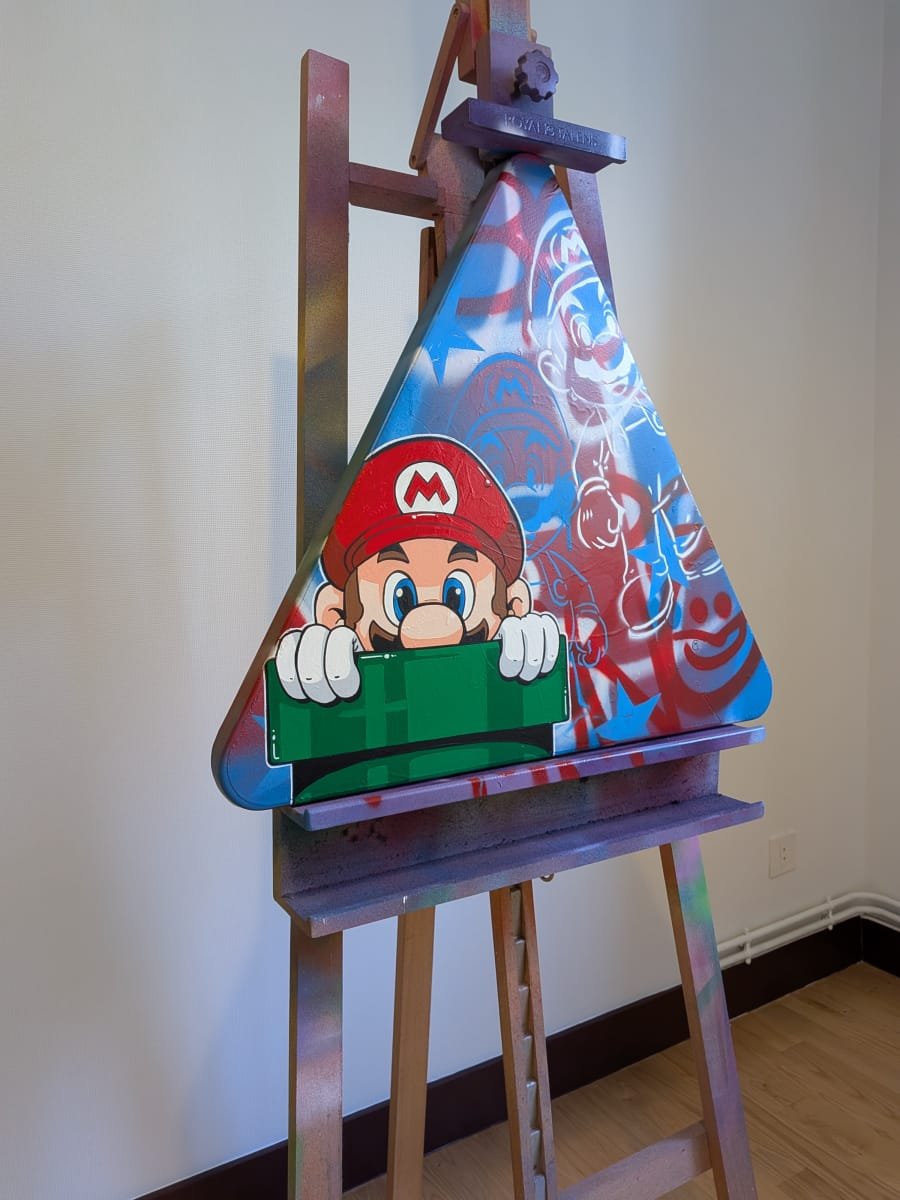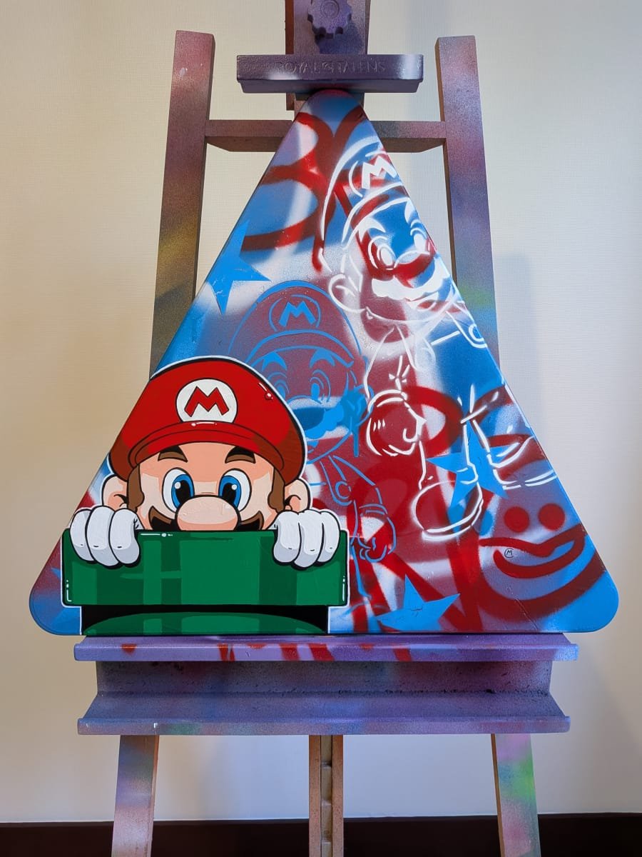 Pour celui-ci, Marcel a choisi d’utiliser un panneau de danger triangulaire. Marcel met en scène Mario, le célèbre plombier de Nintendo. Une fois de plus Marcel Champion travaille sur le cadrage du sujet afin de donner du dynamisme à la toile. C’est son coté auteur de Bd qui ressort et qui “signe” la plupart de ses réalisations. Cette création va ravir les fans de jeux vidéo et apporter une touche fun à votre déco.