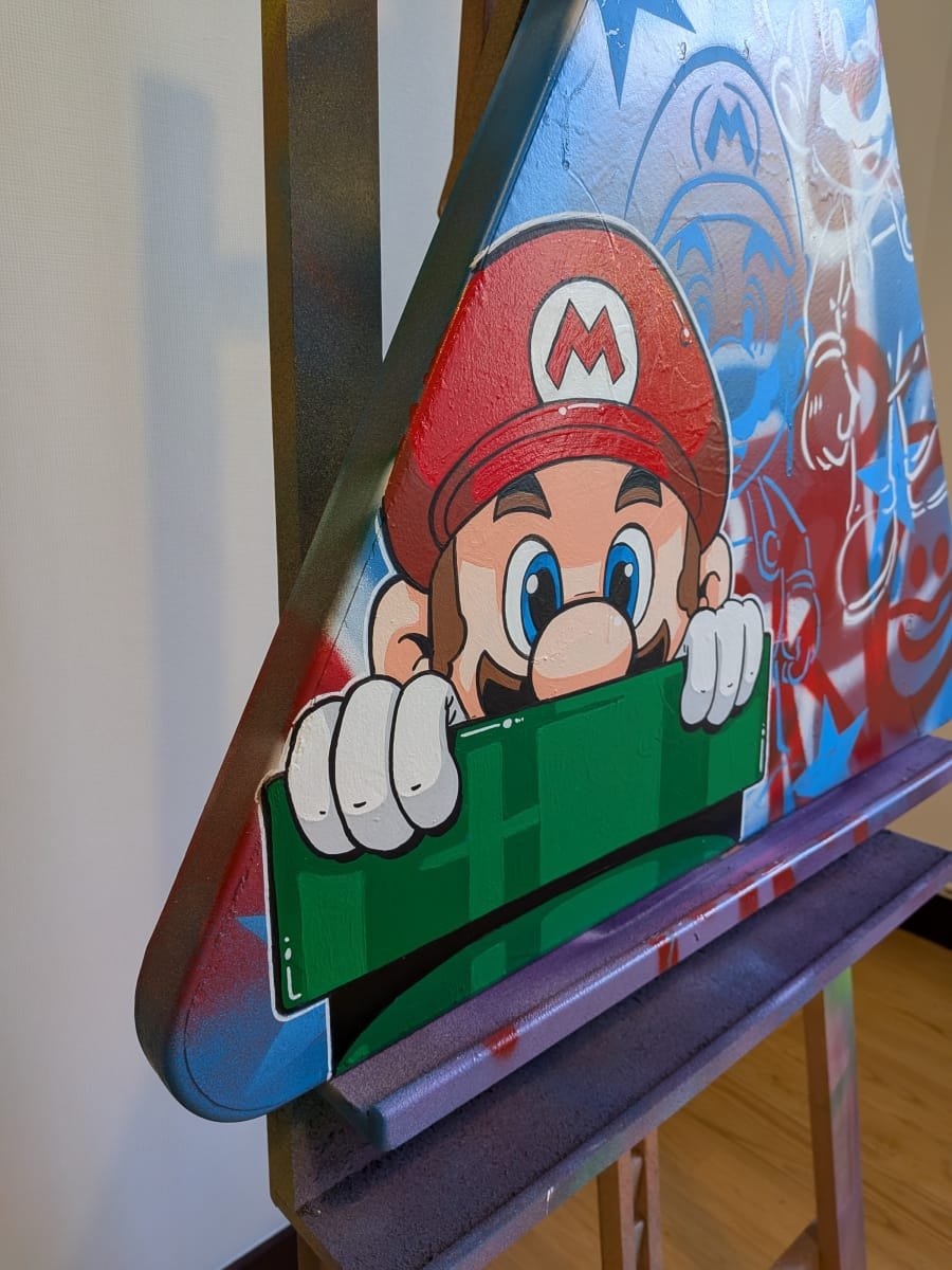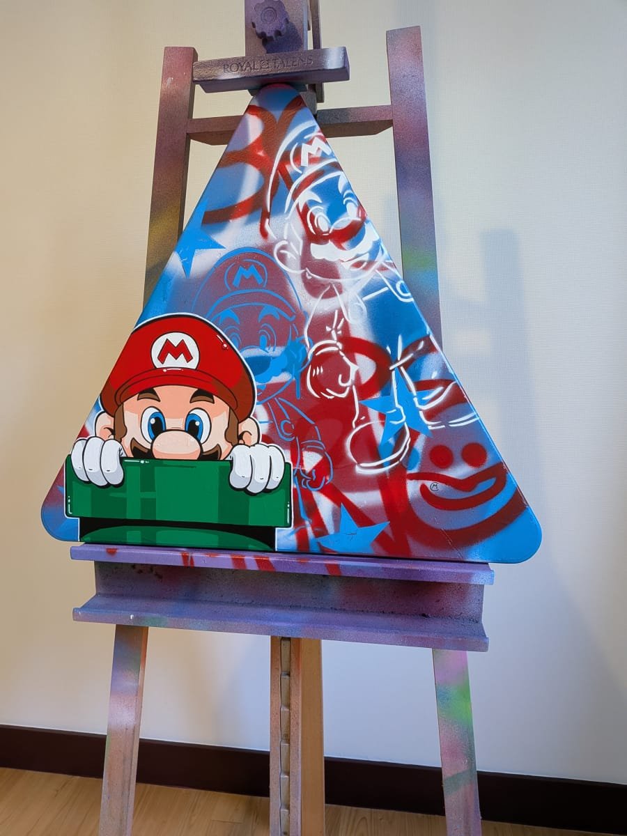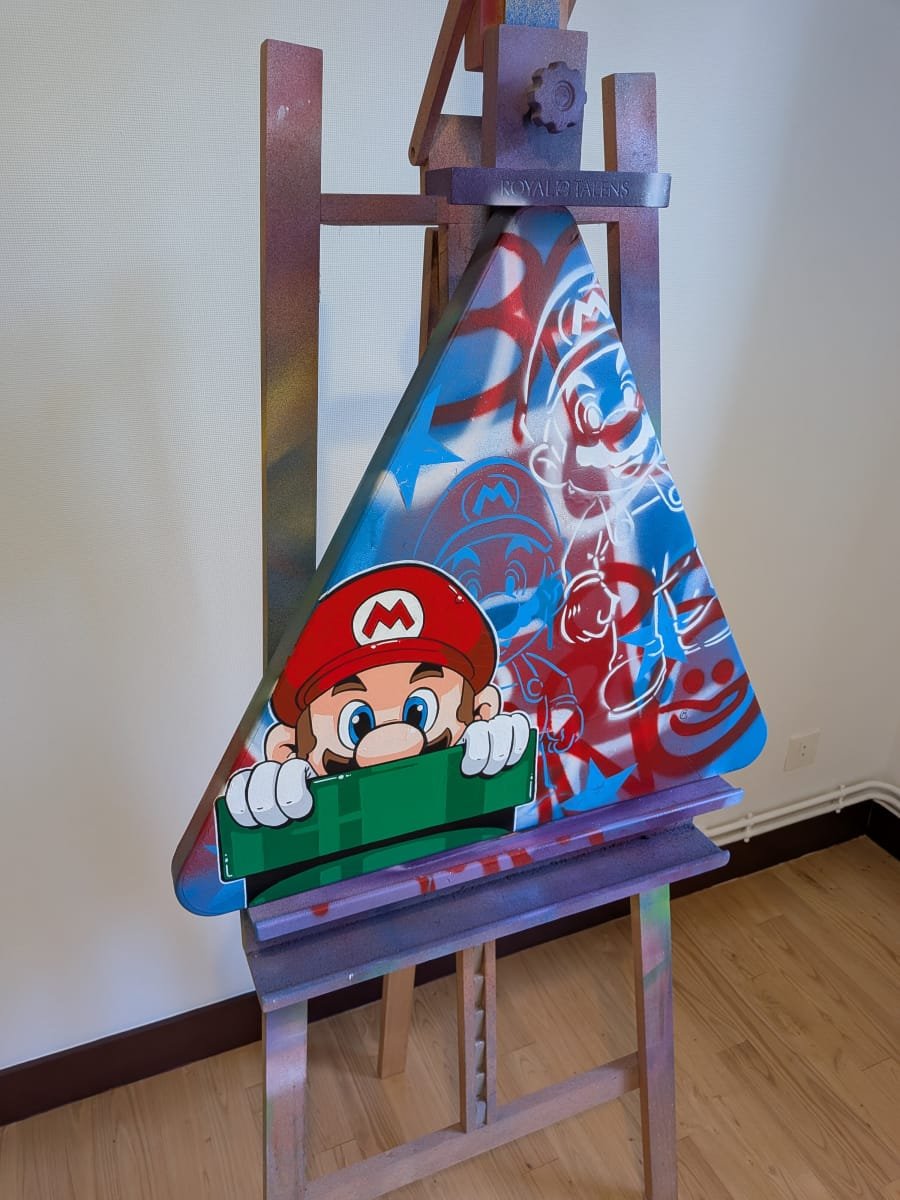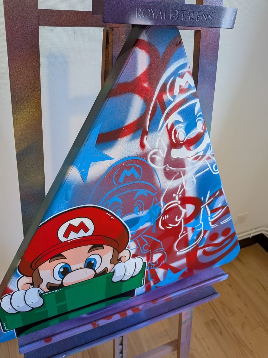 Pour celui-ci, Marcel a choisi d’utiliser un panneau de danger triangulaire. Marcel met en scène Mario, le célèbre plombier de Nintendo. Une fois de plus Marcel Champion travaille sur le cadrage du sujet afin de donner du dynamisme à la toile. C’est son coté auteur de Bd qui ressort et qui “signe” la plupart de ses réalisations. Cette création va ravir les fans de jeux vidéo et apporter une touche fun à votre déco.