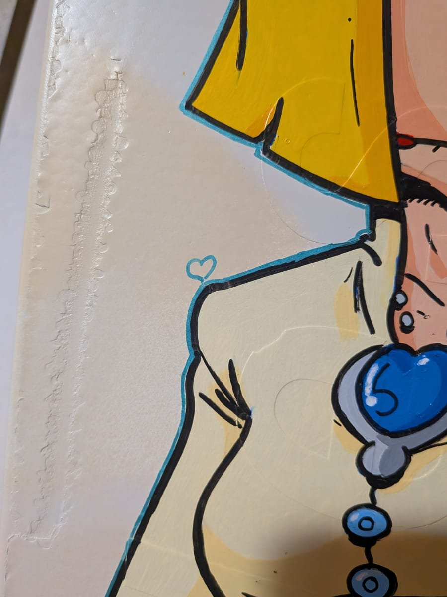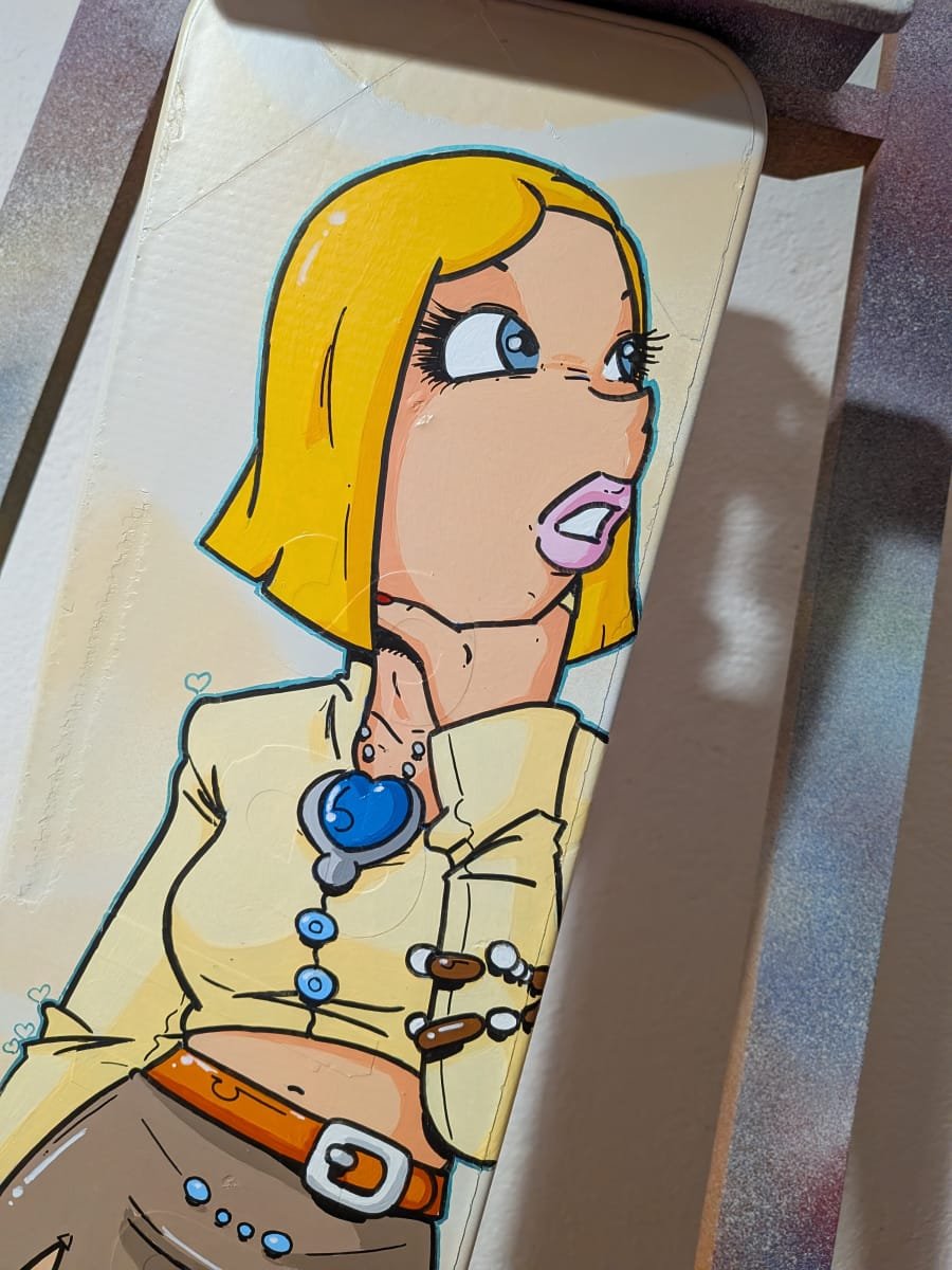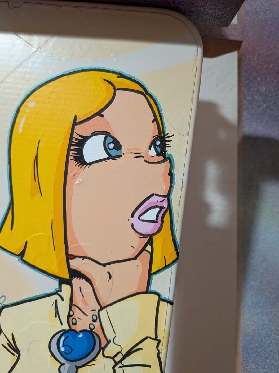 Ce panneau signalétique d’entrée de village reçoit le personnage de Circé Love en décoration.